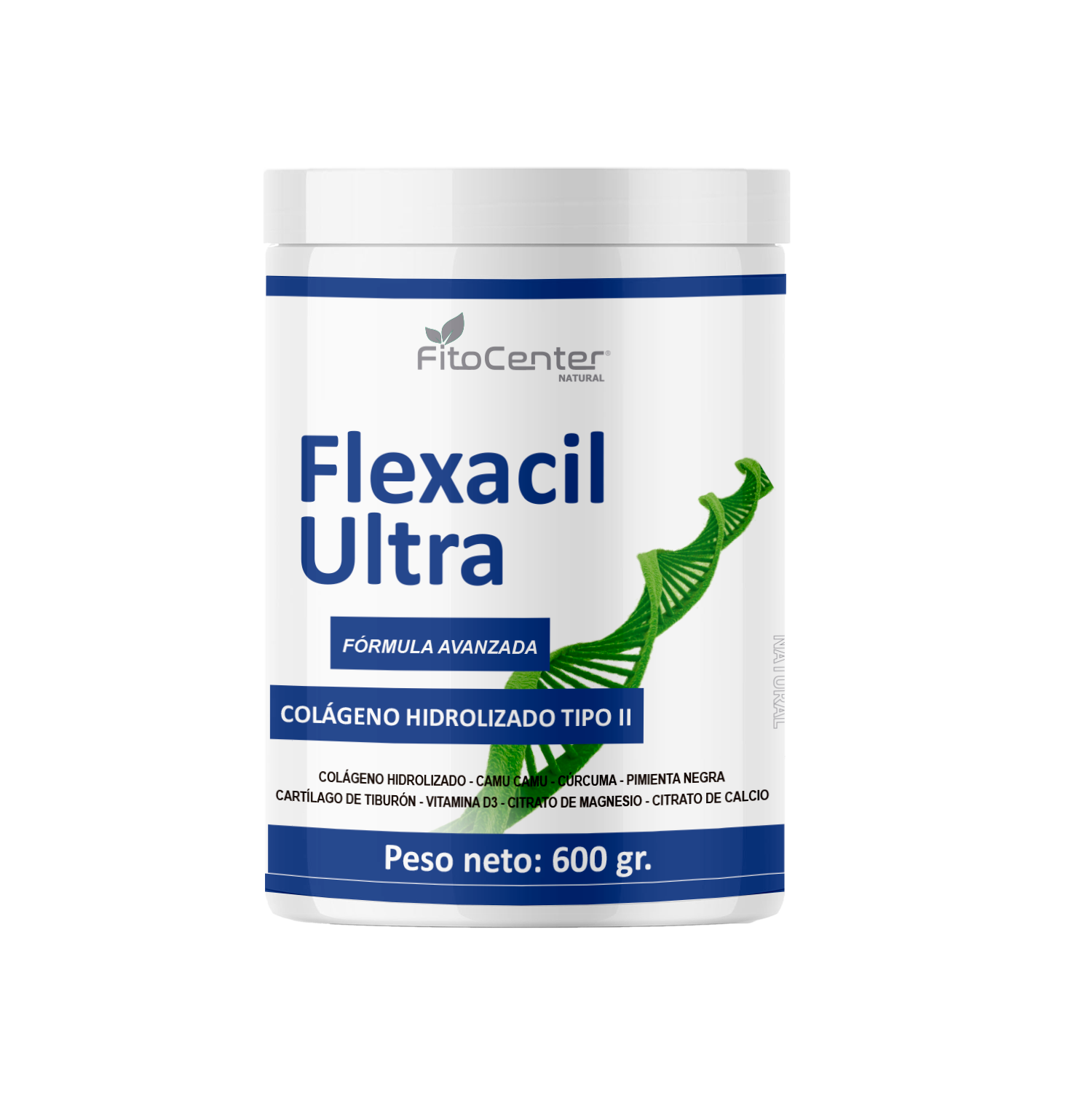 Mezcla en polvo a base de colágeno, camu camu atomizado, pimienta negra, cartílago de tiburón, cúrcuma, vitamina D3, citrato de magnesio y citrato de calcio.